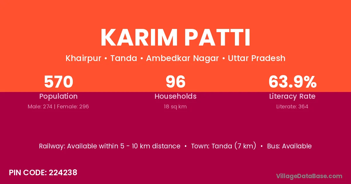 Tanda (7 km) is the nearest town to Karim Patti village for major economic activities and is located approximately 7 km away.