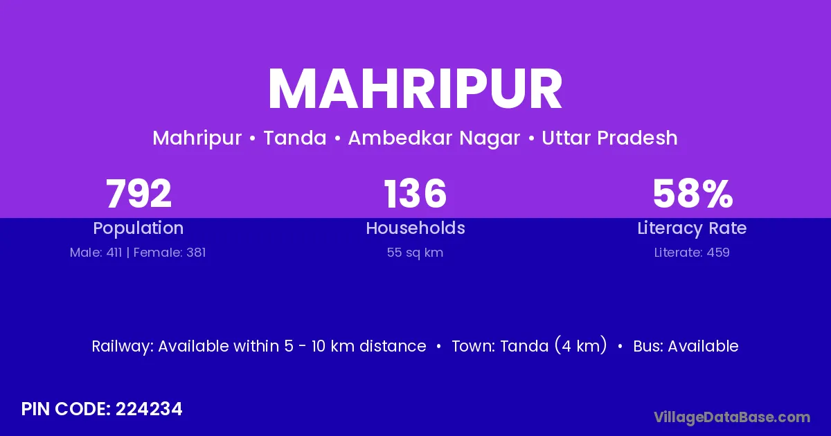 Tanda (4 km) is the nearest town to Mahripur village for major economic activities and is located approximately 4 km away.