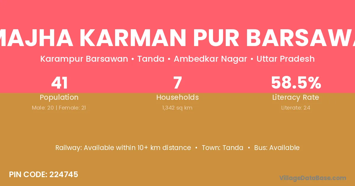 Majha Karman Pur Barsawa village has a total population of 41 people, of which 20 are males and 21 are females.