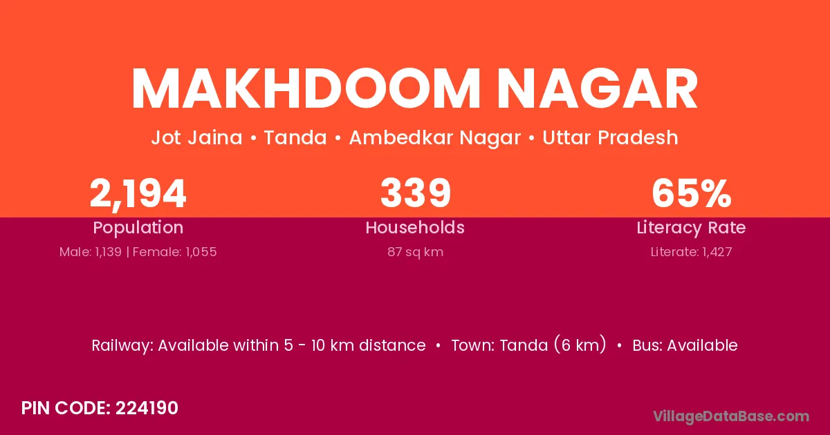 Tanda (6 km) is the nearest town to Makhdoom Nagar village for major economic activities and is located approximately 6 km away.