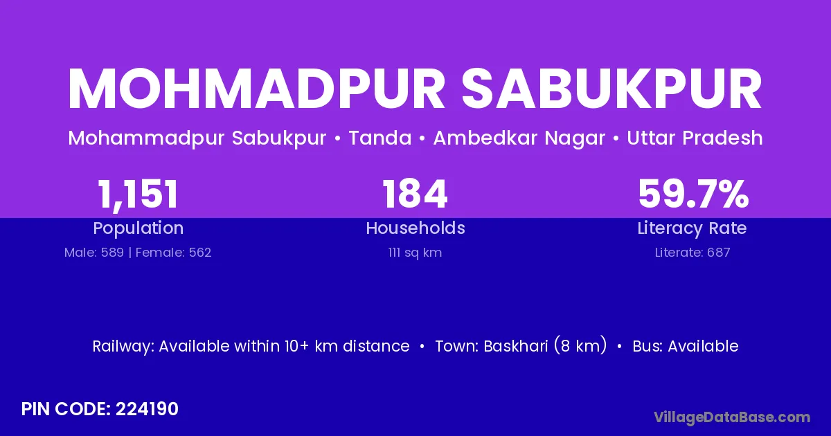 Mohmadpur Sabukpur village has a total population of 1,151 people, of which 589 are males and 562 are females.