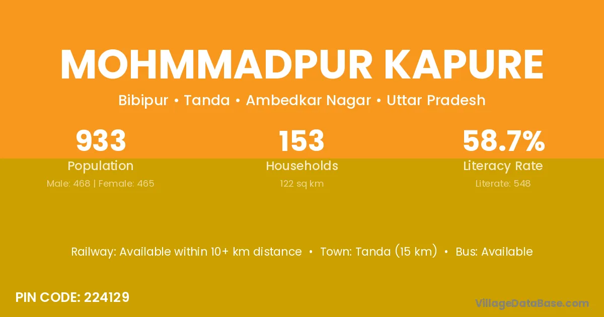 Tanda (15 km) is the nearest town to Mohmmadpur Kapure village for major economic activities and is located approximately 15 km away.