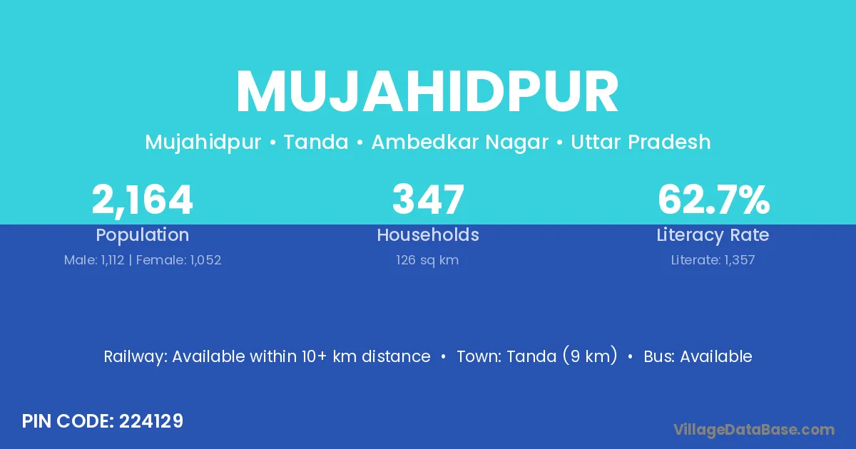 Tanda (9 km) is the nearest town to Mujahidpur village for major economic activities and is located approximately 9 km away.