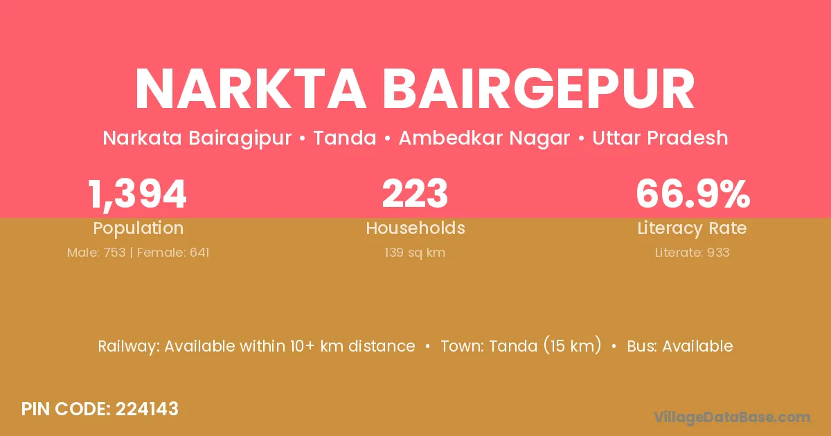 Tanda (15 km) is the nearest town to Narkta Bairgepur village for major economic activities and is located approximately 15 km away.