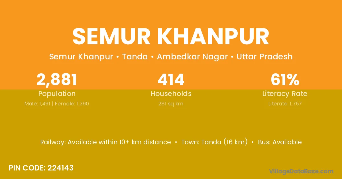 Tanda (16 km) is the nearest town to Semur Khanpur village for major economic activities and is located approximately 16 km away.