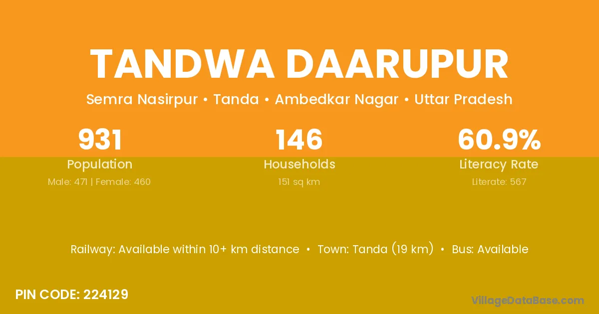 Tandwa Daarupur village has a total population of 931 people, of which 471 are males and 460 are females.