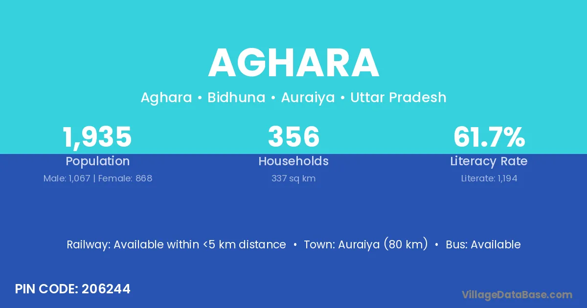 Auraiya (80 km) is the nearest town to Aghara village for major economic activities and is located approximately 80 km away.