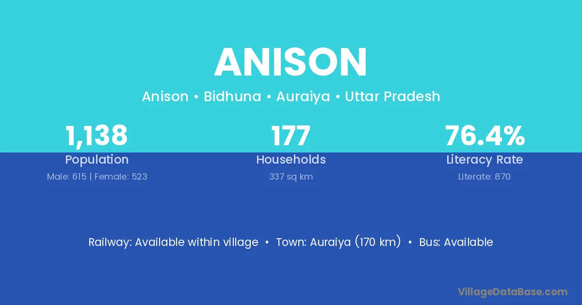 Auraiya (170 km) is the nearest town to Anison village for major economic activities and is located approximately 170 km away.