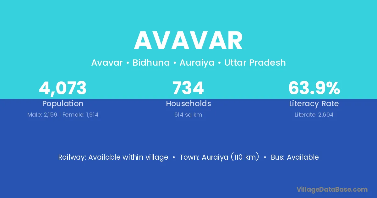 Auraiya (110 km) is the nearest town to Avavar village for major economic activities and is located approximately 110 km away.