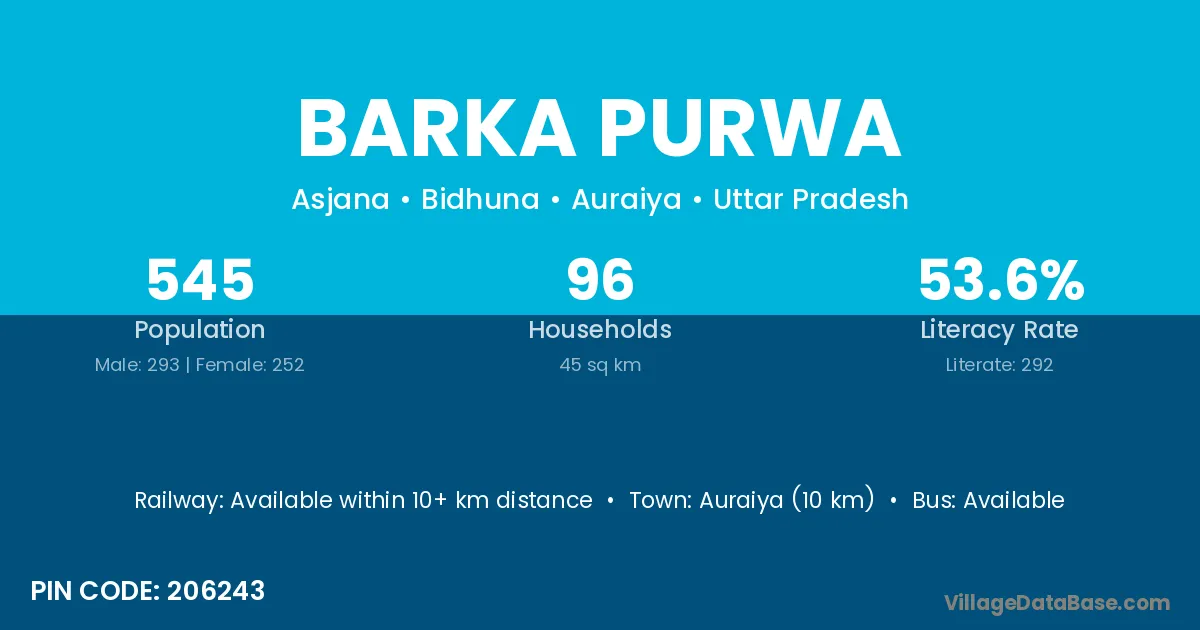 Auraiya (10 km) is the nearest town to Barka Purwa village for major economic activities and is located approximately 10 km away.