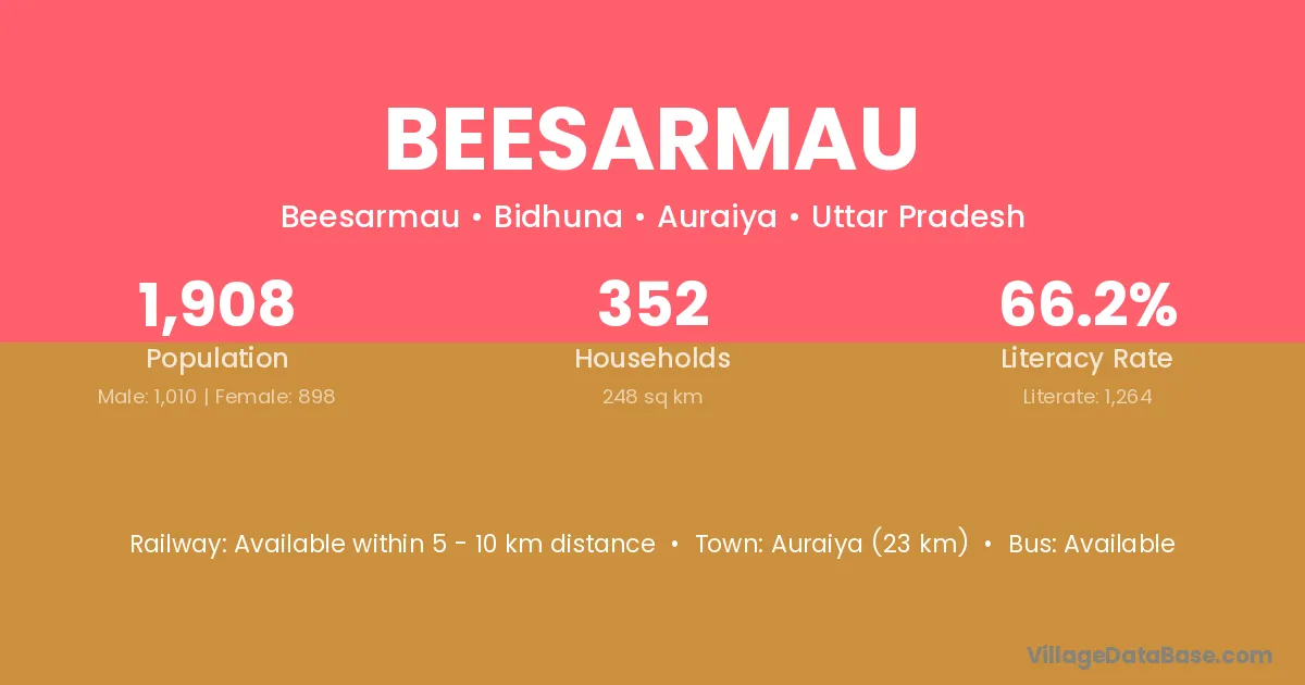 Auraiya (23 km) is the nearest town to Beesarmau village for major economic activities and is located approximately 23 km away.