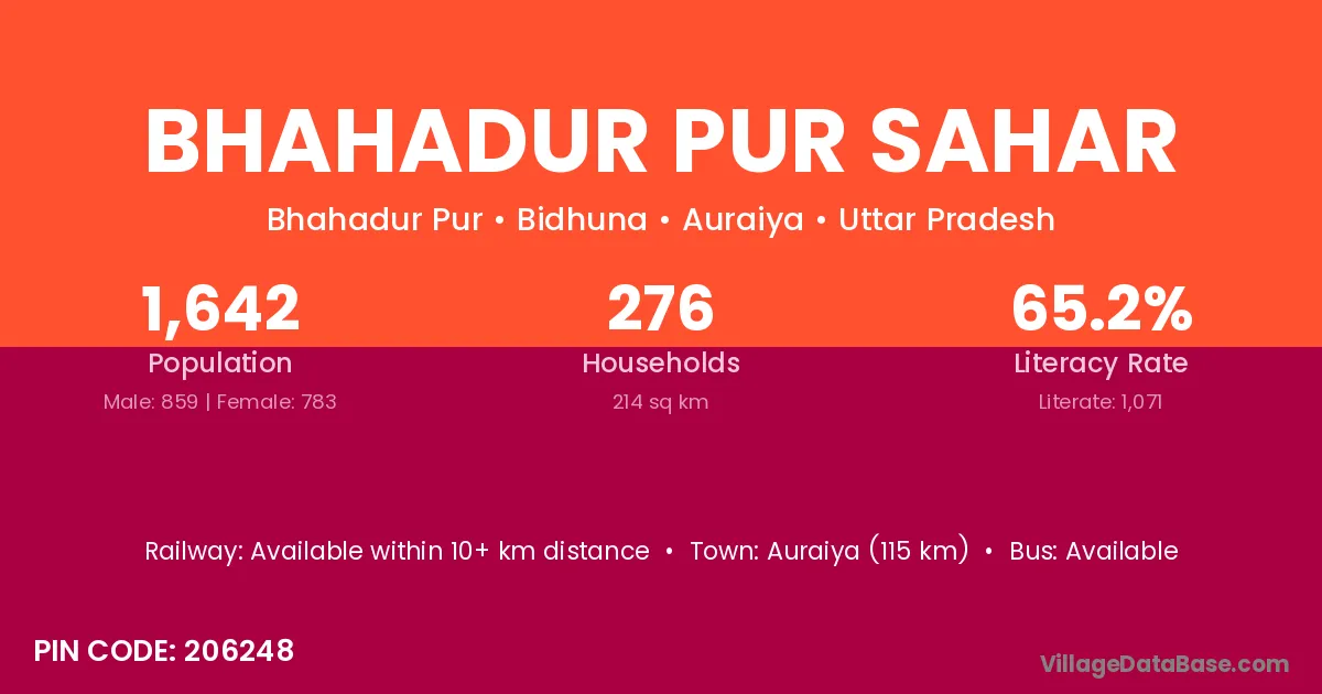 Auraiya (115 km) is the nearest town to Bhahadur Pur Sahar village for major economic activities and is located approximately 115 km away.