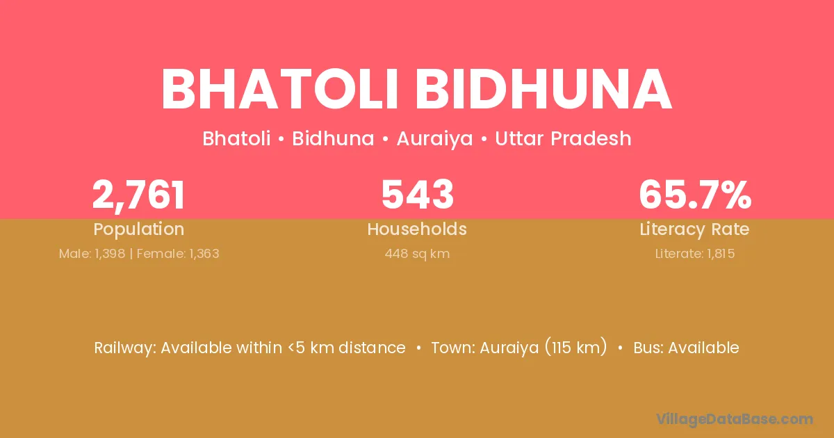 Auraiya (115 km) is the nearest town to Bhatoli Bidhuna village for major economic activities and is located approximately 115 km away.