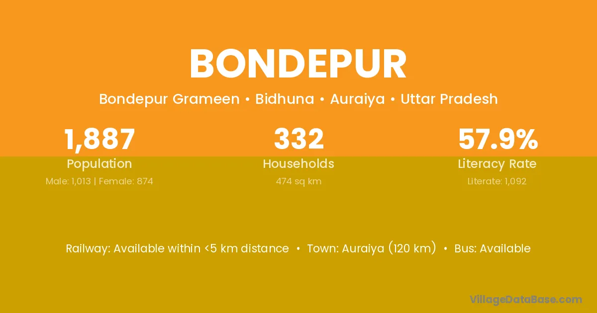 Auraiya (120 km) is the nearest town to Bondepur village for major economic activities and is located approximately 120 km away.
