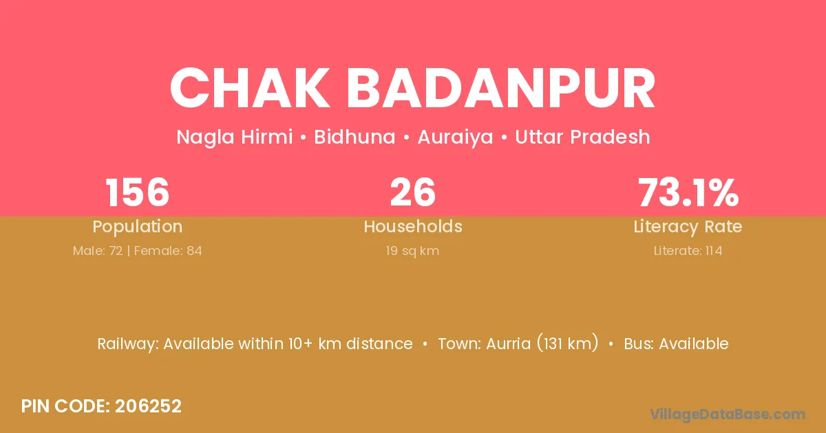 Chak Badanpur village has a total population of 156 people, of which 72 are males and 84 are females.