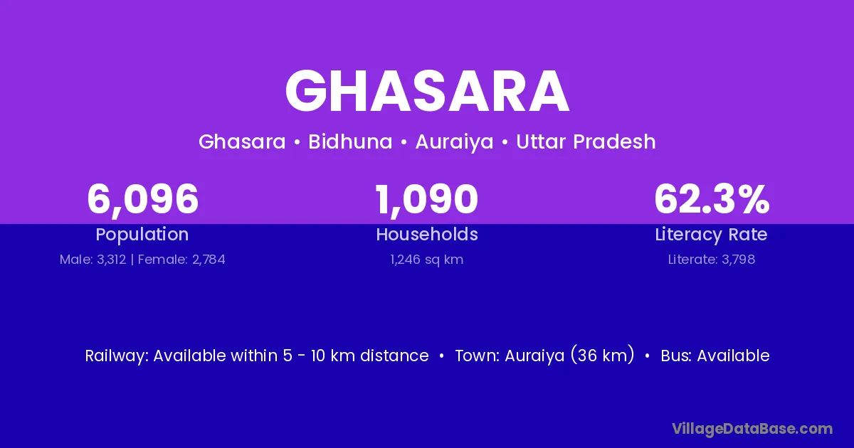Auraiya (36 km) is the nearest town to Ghasara village for major economic activities and is located approximately 36 km away.