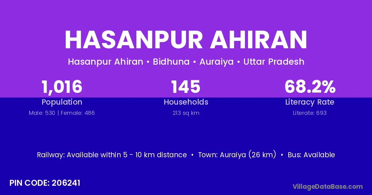 Auraiya (26 km) is the nearest town to Hasanpur Ahiran village for major economic activities and is located approximately 26 km away.