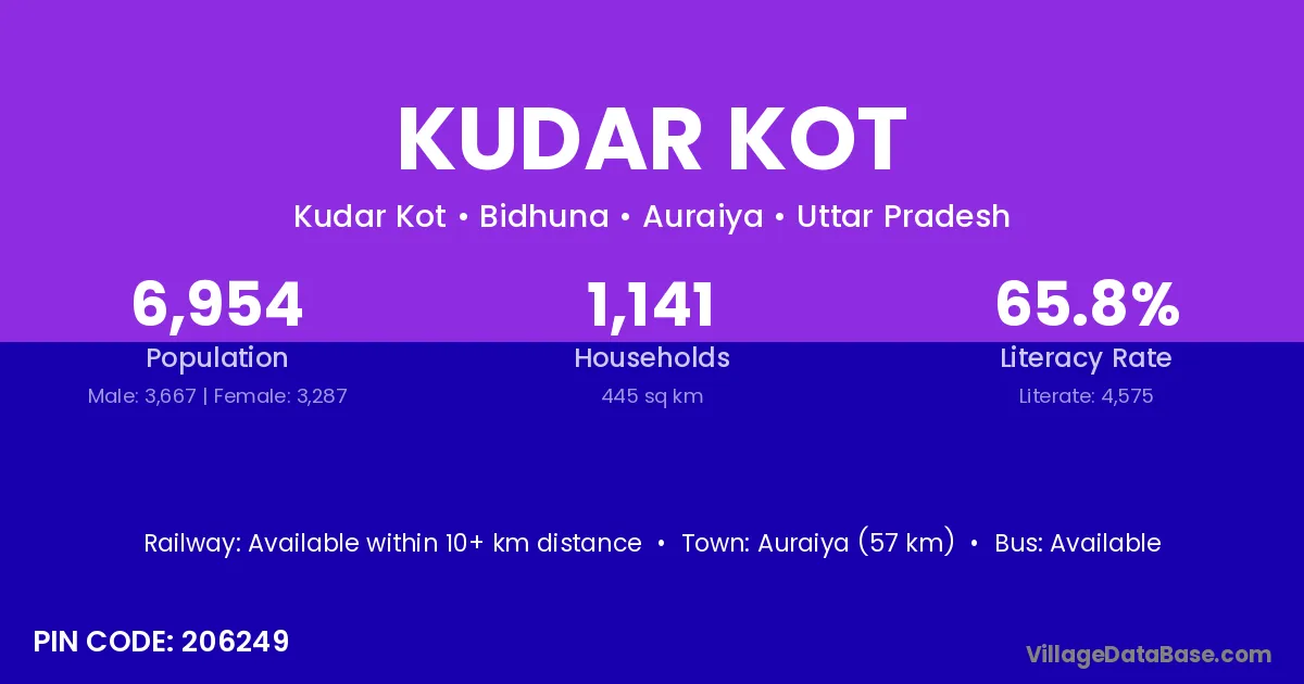 Auraiya (57 km) is the nearest town to Kudar Kot village for major economic activities and is located approximately 57 km away.
