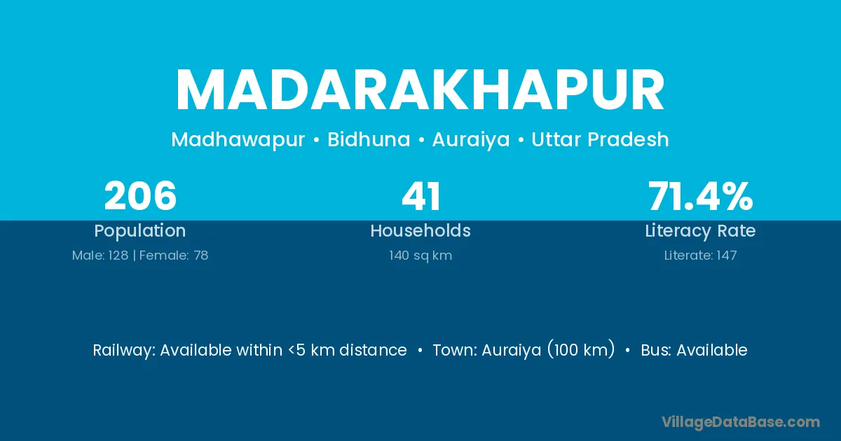 Auraiya (100 km) is the nearest town to Madarakhapur village for major economic activities and is located approximately 100 km away.