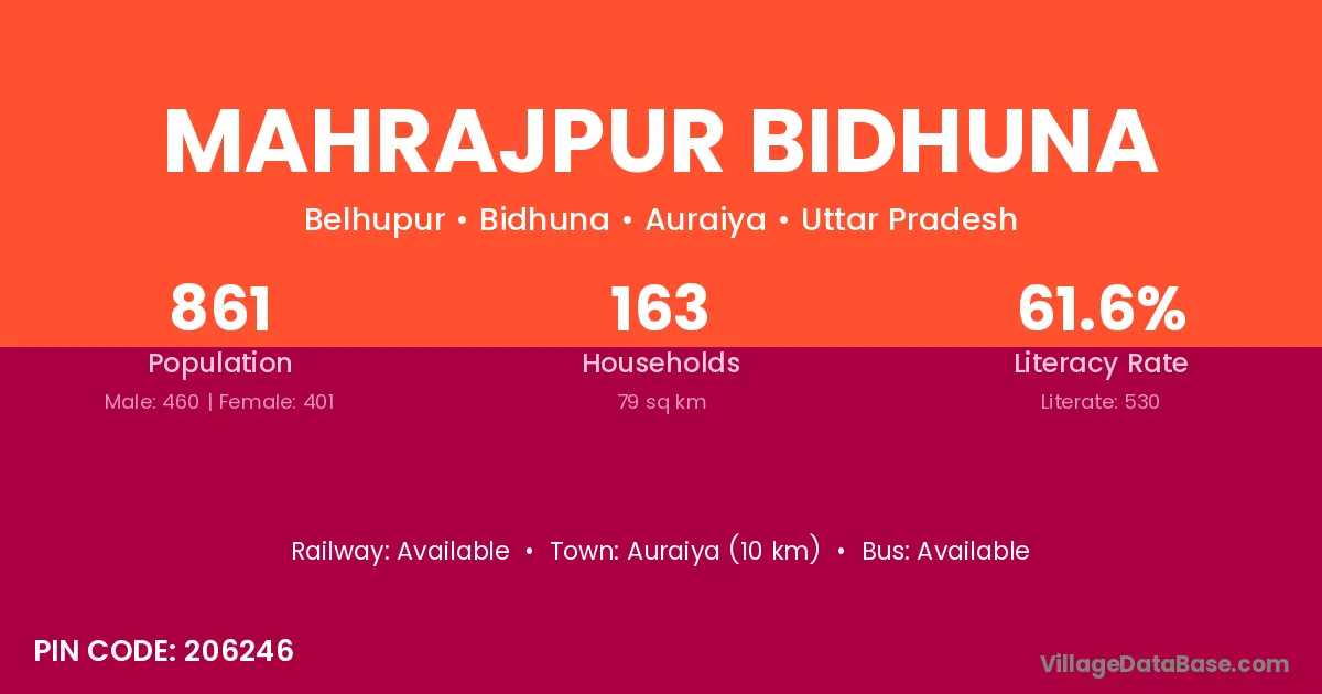 Auraiya (10 km) is the nearest town to Mahrajpur Bidhuna village for major economic activities and is located approximately 10 km away.