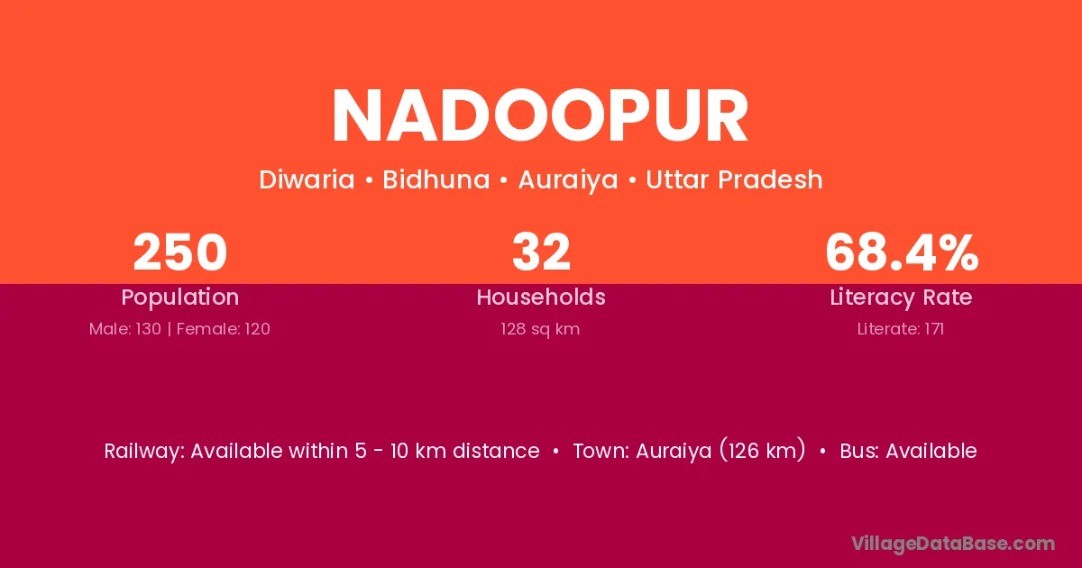 Auraiya (126 km) is the nearest town to Nadoopur village for major economic activities and is located approximately 126 km away.