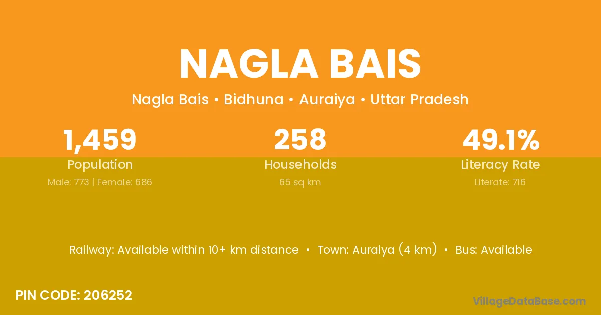 Auraiya (4 km) is the nearest town to Nagla Bais village for major economic activities and is located approximately 4 km away.