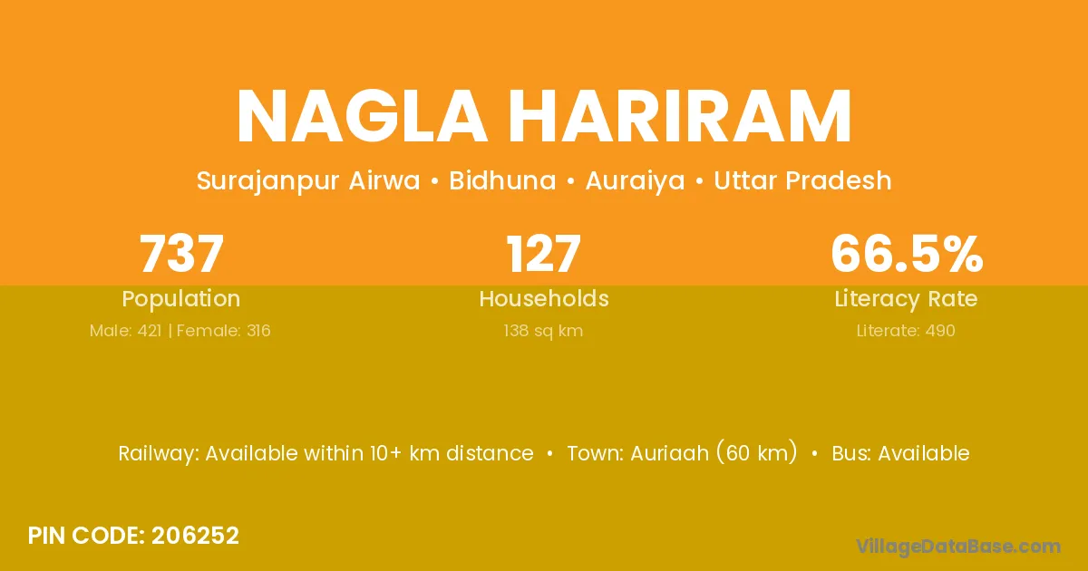 Auriaah (60 km) is the nearest town to Nagla Hariram village for major economic activities and is located approximately 60 km away.