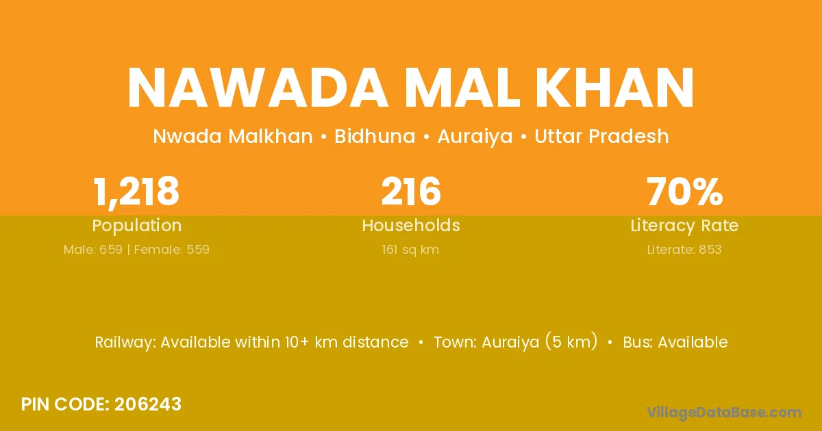 Auraiya (5 km) is the nearest town to Nawada Mal Khan village for major economic activities and is located approximately 5 km away.