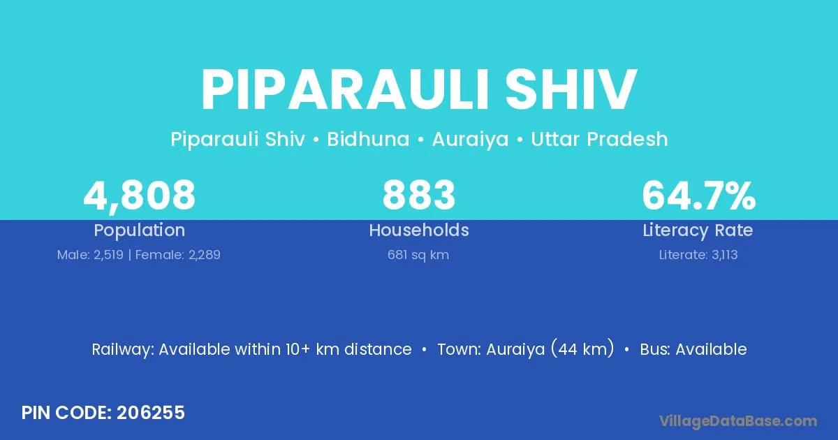 Auraiya (44 km) is the nearest town to Piparauli Shiv village for major economic activities and is located approximately 44 km away.
