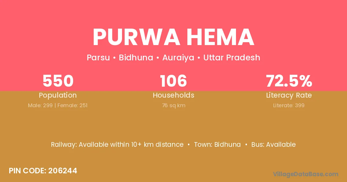 Purwa Hema village has a total population of 550 people, of which 299 are males and 251 are females.