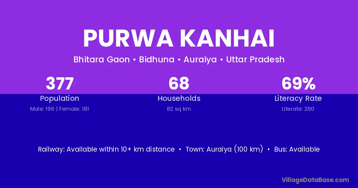 Purwa Kanhai village has a total population of 377 people, of which 196 are males and 181 are females.