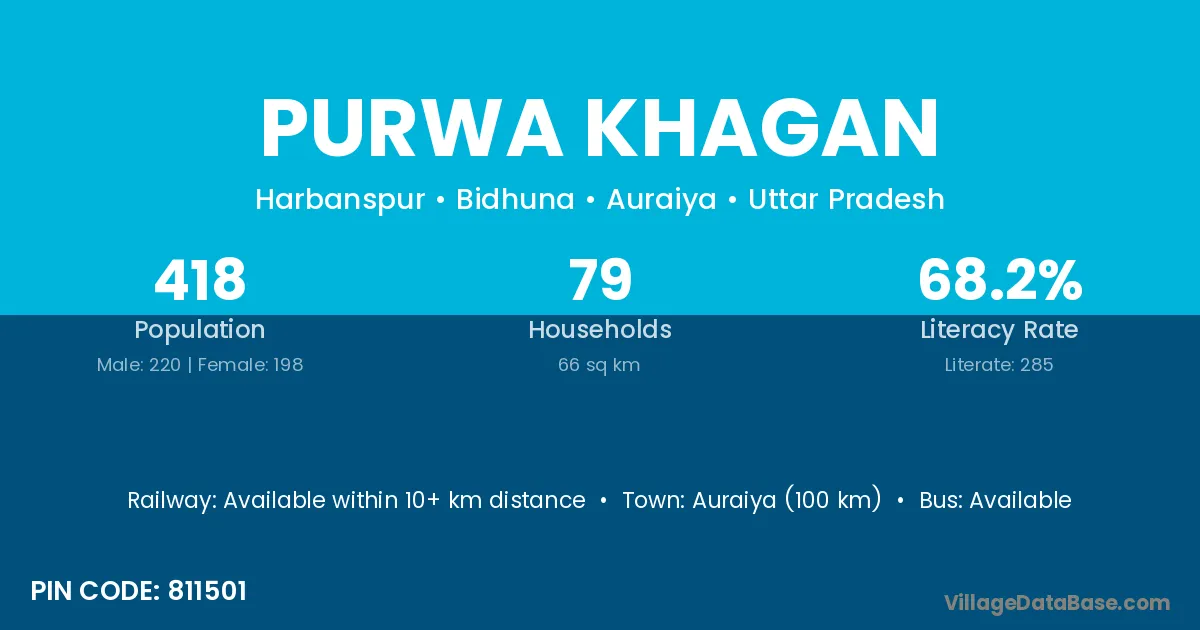 Purwa Khagan village has a total population of 418 people, of which 220 are males and 198 are females.