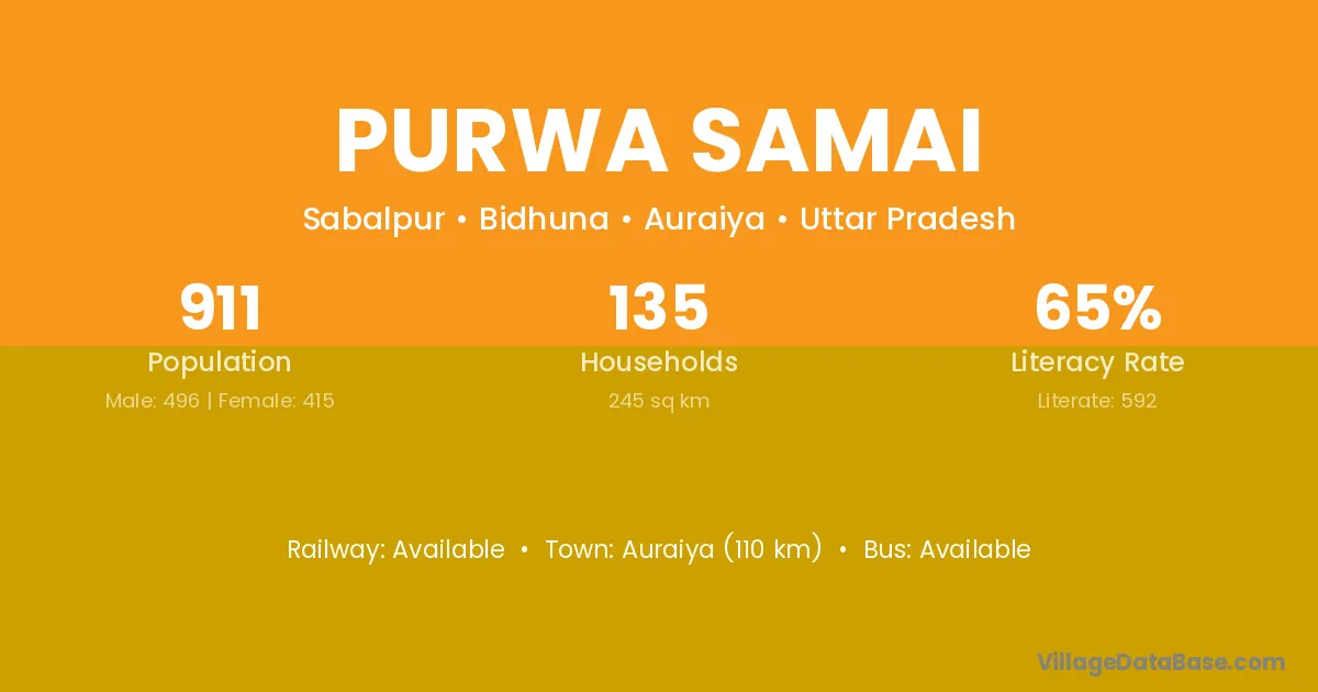 Purwa Samai village has a total population of 911 people, of which 496 are males and 415 are females.