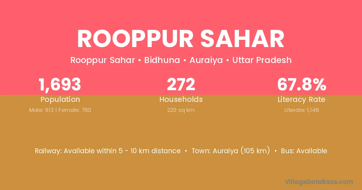 Auraiya (105 km) is the nearest town to Rooppur Sahar village for major economic activities and is located approximately 105 km away.