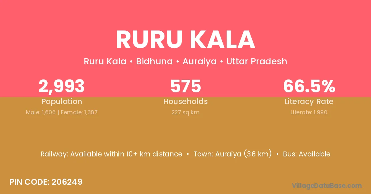 Auraiya (36 km) is the nearest town to Ruru Kala village for major economic activities and is located approximately 36 km away.