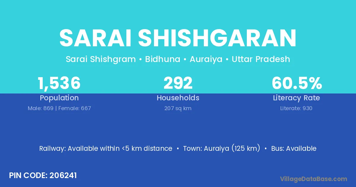 Auraiya (125 km) is the nearest town to Sarai Shishgaran village for major economic activities and is located approximately 125 km away.