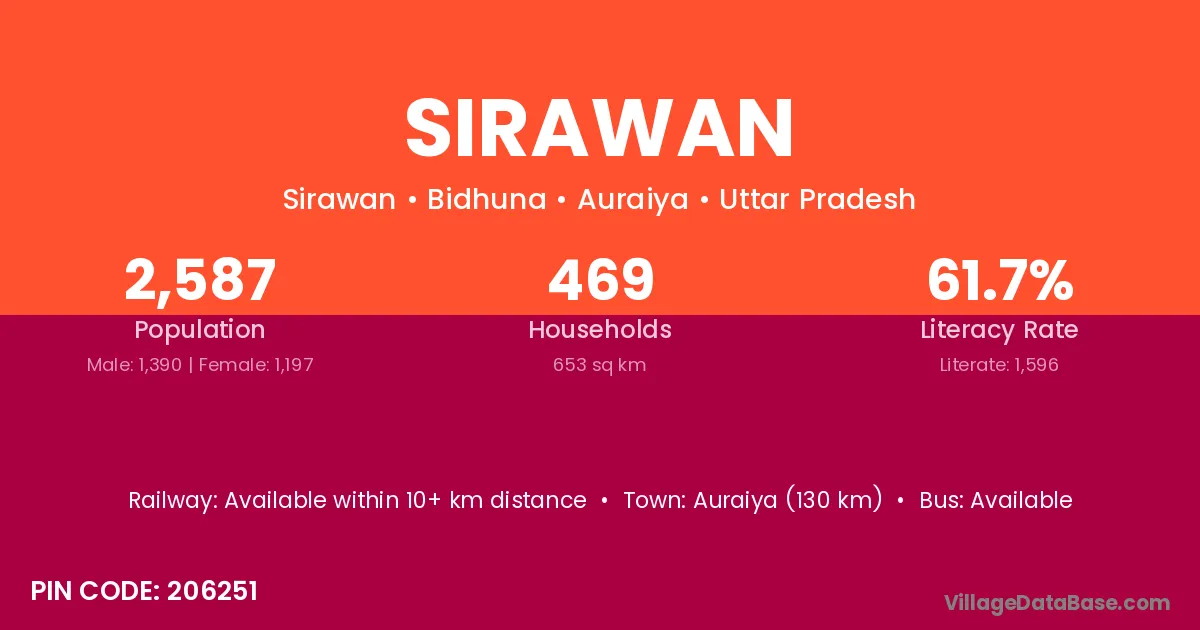Auraiya (130 km) is the nearest town to Sirawan village for major economic activities and is located approximately 130 km away.