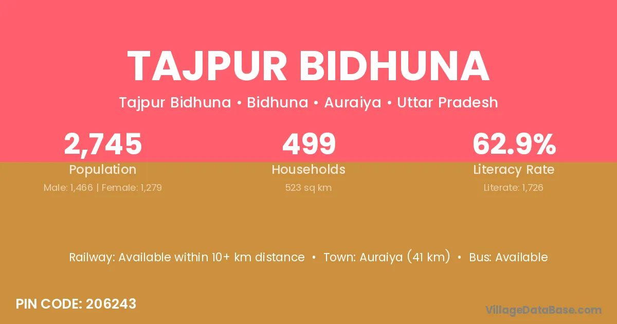 Auraiya (41 km) is the nearest town to Tajpur Bidhuna village for major economic activities and is located approximately 41 km away.