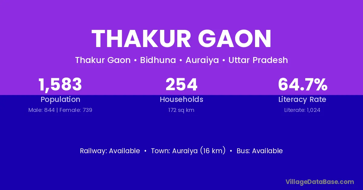 Auraiya (16 km) is the nearest town to Thakur Gaon village for major economic activities and is located approximately 16 km away.