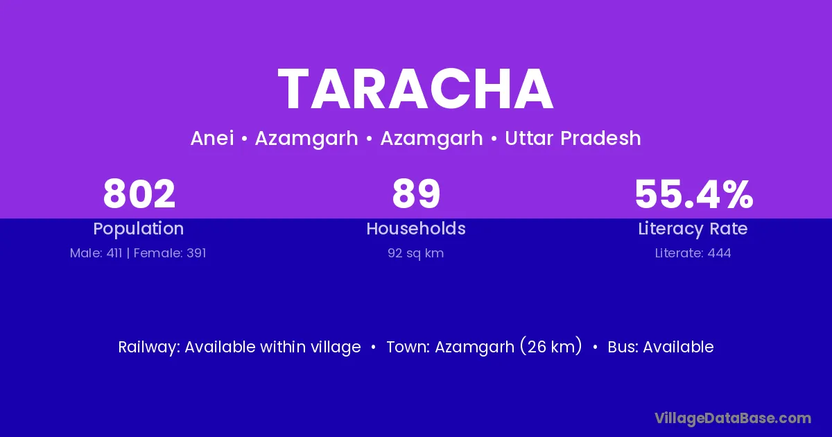 Azamgarh (26 km) is the nearest town to Taracha village for major economic activities and is located approximately 26 km away.