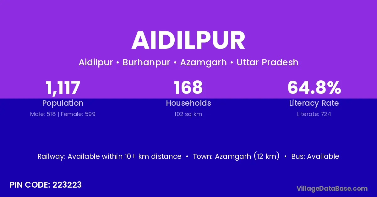Azamgarh (12 km) is the nearest town to Aidilpur village for major economic activities and is located approximately 12 km away.