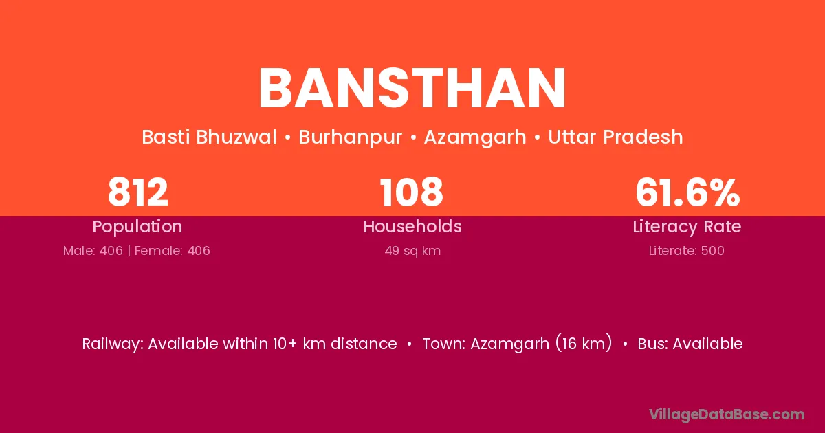 Azamgarh (16 km) is the nearest town to Bansthan village for major economic activities and is located approximately 16 km away.