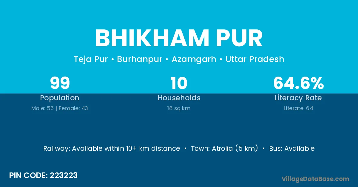 Atrolia (5 km) is the nearest town to Bhikham Pur village for major economic activities and is located approximately 5 km away.