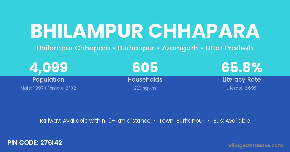 Bhilampur Chhapara village has a total population of 4,099 people, of which 1,997 are males and 2,102 are females.