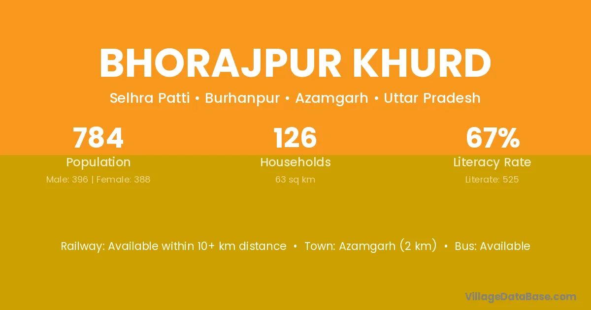 Azamgarh (2 km) is the nearest town to Bhorajpur Khurd village for major economic activities and is located approximately 2 km away.