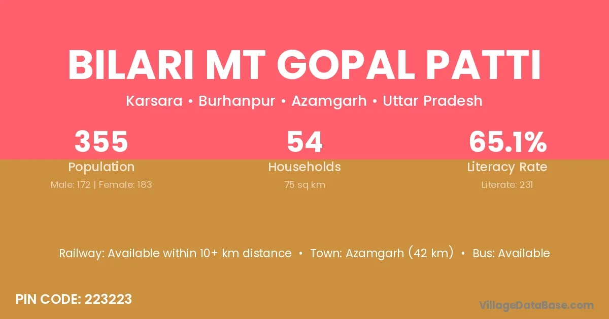 Azamgarh (42 km) is the nearest town to Bilari Mt Gopal Patti village for major economic activities and is located approximately 42 km away.