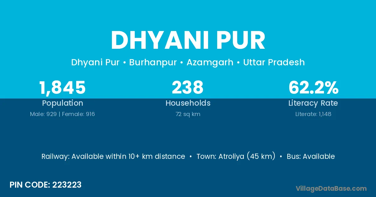 Atroliya (45 km) is the nearest town to Dhyani Pur village for major economic activities and is located approximately 45 km away.