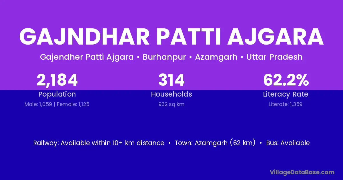Azamgarh (62 km) is the nearest town to Gajndhar Patti Ajgara village for major economic activities and is located approximately 62 km away.