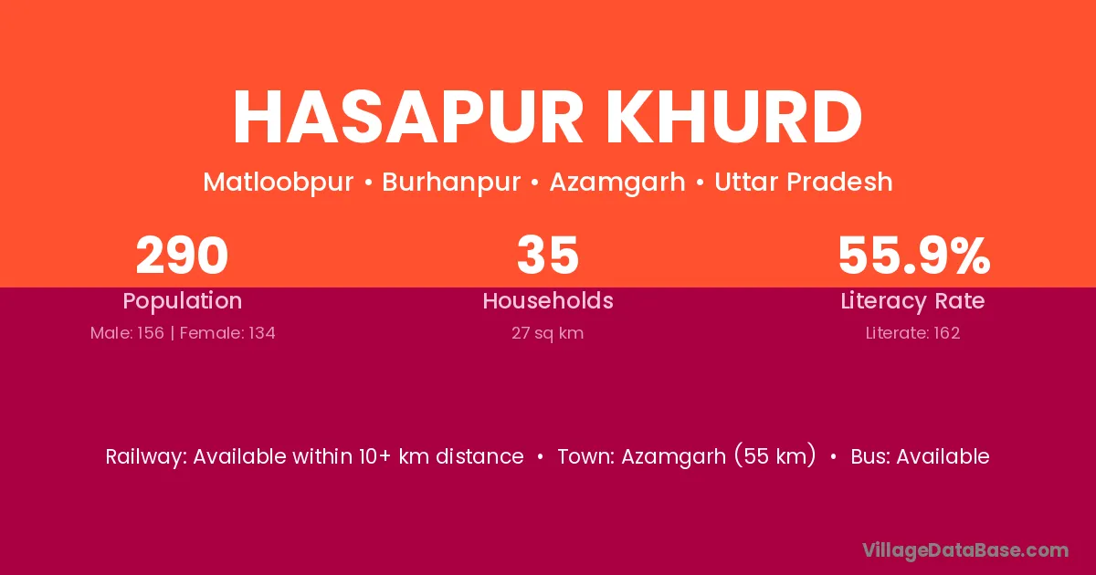 Azamgarh (55 km) is the nearest town to Hasapur Khurd village for major economic activities and is located approximately 55 km away.