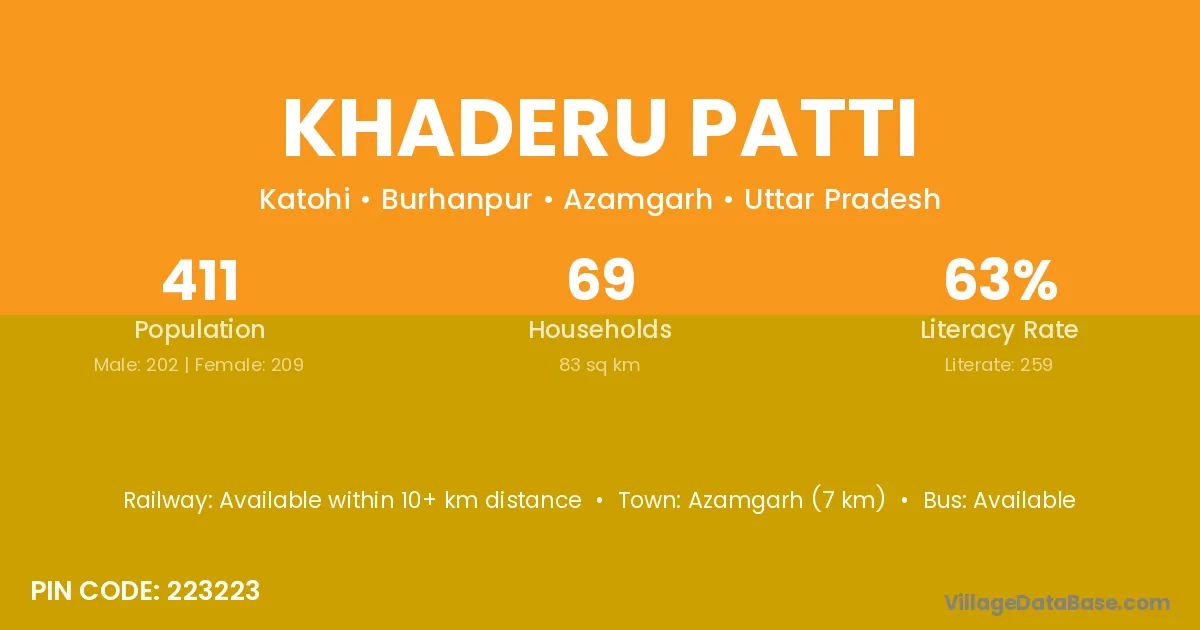 Azamgarh (7 km) is the nearest town to Khaderu Patti village for major economic activities and is located approximately 7 km away.